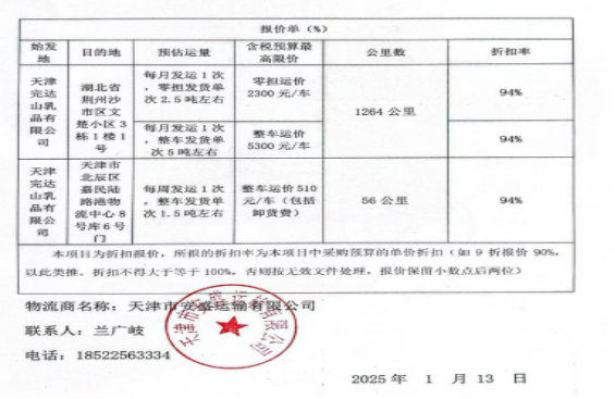 三、项目用途、简要技术要求及合同履行日期:项目为特渠营销事业部团购配送运输服务,年运量总计预计162吨左右,项目预算总计12万元。服务期为合同签订后的十二个月。服务地点天乳工厂运往湖北省荆州沙市区、天乳工厂运往天津市北辰区运输线路。